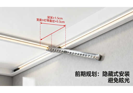 對于暗藏式安裝,提前預(yù)留燈槽深度至關(guān)重要。木工階段需讓師傅預(yù)留≥3cm的燈槽寬度,深度建議比燈帶厚度多5mm,這樣既能避免燈光溢出形成光斑,又能預(yù)留散熱空間。若采用明裝方案,可選擇帶鋁槽的防水燈帶,不僅能起到物理防護(hù)作用,鋁合金材質(zhì)還能增強(qiáng)散熱,延長燈帶使用壽命30%以上。