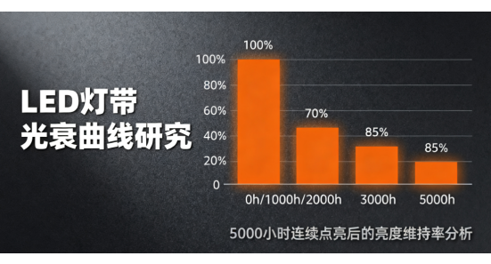 在LED照明技術(shù)迅猛發(fā)展的今天,LED燈帶憑借其安裝便捷、裝飾性強、能耗低等優(yōu)勢,已廣泛應用于家居裝飾、商業(yè)照明、戶外景觀等領(lǐng)域。然而,隨著使用時間的延長,LED燈帶的亮度會逐漸下降,這種現(xiàn)象被稱為"光衰"。光衰不僅影響照明效果,更直接關(guān)系到產(chǎn)品的使用壽命和用戶體驗。本文通過對某品牌高品質(zhì)LED燈帶進行5000小時連續(xù)點亮實驗,深入分析其光衰曲線特征及亮度維持率變化規(guī)律,為消費者選購和行業(yè)技術(shù)優(yōu)化提供科學參考。