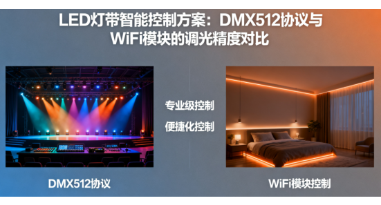 在現(xiàn)代照明設(shè)計(jì)中,LED燈帶憑借其靈活的安裝方式與豐富的動(dòng)態(tài)效果,已成為商業(yè)空間裝飾、家庭氛圍營(yíng)造及舞臺(tái)燈光設(shè)計(jì)的核心元素。隨著智能控制技術(shù)的發(fā)展,如何實(shí)現(xiàn)高精度、高穩(wěn)定性的調(diào)光控制,成為行業(yè)關(guān)注的焦點(diǎn)。目前主流的控制方案中,DMX512協(xié)議與WiFi模塊應(yīng)用最為廣泛,但兩者在調(diào)光精度、響應(yīng)速度、抗干擾能力等關(guān)鍵指標(biāo)上存在顯著差異。本文將從技術(shù)原理、實(shí)際應(yīng)用場(chǎng)景及性能測(cè)試數(shù)據(jù)三個(gè)維度,深入對(duì)比兩種方案的調(diào)光特性,為不同場(chǎng)景下的方案選型提供專(zhuān)業(yè)參考。