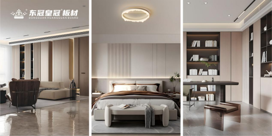 木材的溫度,能瞬間軟化冰冷的空間。東冠皇冠板材適用于全屋定制,從櫥柜、衣柜到墻面、地板,都能以木紋的天然韻律,營造出寧靜而高級的氛圍。