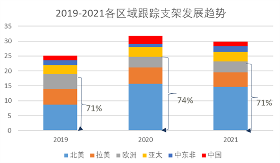北美市場常年占據(jù)跟蹤支架總市場約50%的份額;2019-2021,北美,拉美,歐洲三大區(qū)在全球支架總占比均在70%左右。