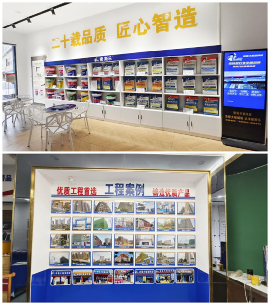 全新展廳的整體設計采用了密斯樂瓷磚膠統(tǒng)一的企業(yè)設計標準,陳列的瓷磚膠產(chǎn)品整潔有序,裝潢設計明亮,空間感十足,密斯樂瓷磚膠標志性的設計元素隨處可見,為客戶打造一個全方位的純粹“密斯樂瓷磚膠世界”。
