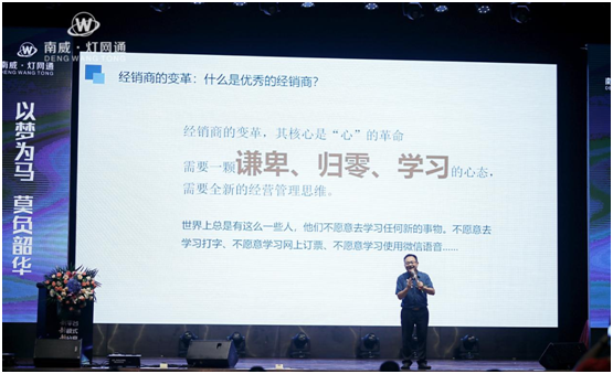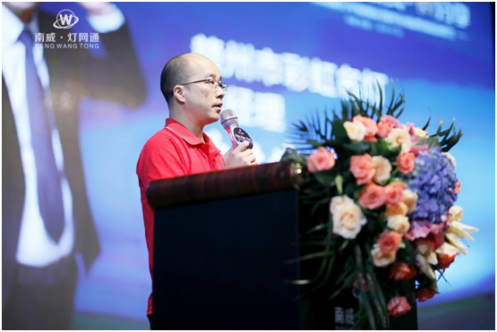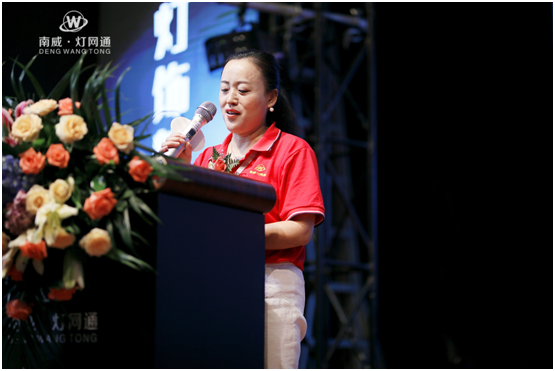 此時(shí),舞臺(tái)主角切換至南威·燈網(wǎng)通的經(jīng)銷商家人們??偛垦?qǐng)出兩位優(yōu)秀經(jīng)銷商代表演講,他們分別是成都華潤燈飾總經(jīng)理劉文瓊女士與贛州市彩虹名燈總經(jīng)理曾昭斌先生。他們從經(jīng)銷商合作伙伴、創(chuàng)業(yè)人士的自身視角,講述與南威·燈網(wǎng)通的合作歷程,分享經(jīng)營終端門店的成功經(jīng)驗(yàn)與挫折教訓(xùn),為在場(chǎng)伙伴帶來了實(shí)用性啟發(fā)。