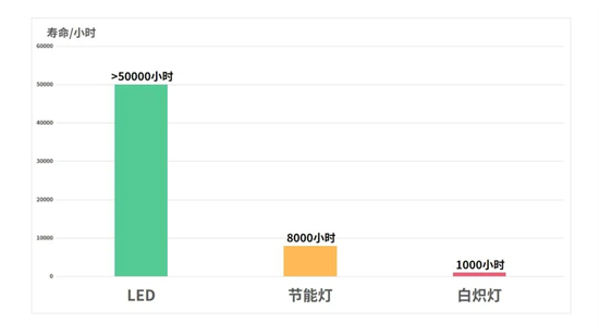 節(jié)能。LED作為一種將電能直接轉(zhuǎn)化為光能的發(fā)光器件,能量轉(zhuǎn)化效率高。同等亮度下,能耗僅為白熾燈的10%,節(jié)能燈的25%。不同燈具的能量轉(zhuǎn)化效率