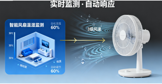 傳統(tǒng)風扇的核心功能局限于“加速空氣流動”,用戶需手動調節(jié)風速、搖頭角度,甚至頻繁開關以適應環(huán)境變化。而智能風扇的溫濕雙控技術,通過內置多維度傳感器與智能算法的協(xié)同,實現(xiàn)了從“人控”到“自控”的跨越。其本質是讓風扇成為環(huán)境的“感知者”與“調節(jié)者”——不僅能實時捕捉溫度、濕度的細微變化,更能基于人體舒適閾值主動優(yōu)化送風策略,真正做到“環(huán)境未變,風扇先動”。