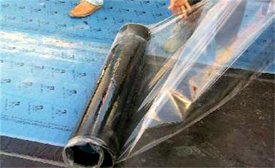以合成橡膠、增粘劑及石油瀝青為基料,表面覆以高密度聚乙烯膜或鋁箔,底面覆以可剝離的防粘隔離膜的無(wú)胎自粘防水卷材。