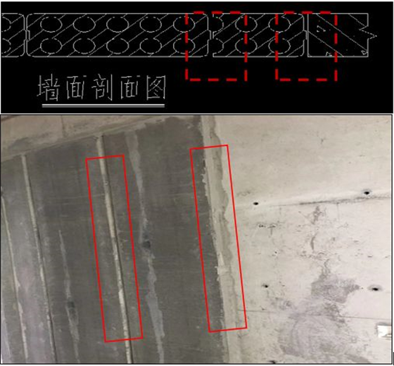 【處理措施】① 圖左側(cè)切割面位于孔部位,在排版過程中應(yīng)避免出現(xiàn),可更改切割位置至實(shí)心處。如無法避免此類情況,在墻板上墻過程中優(yōu)先對墻板孔洞部位進(jìn)行填實(shí)處理。② 圖右側(cè)與結(jié)構(gòu)相接部位必須漿料飽滿,傳統(tǒng)抹灰項(xiàng)目鋼絲網(wǎng)必須設(shè)置到位;鋁模項(xiàng)目必須留設(shè)啟口,保證板縫位置加強(qiáng)網(wǎng)處理。
