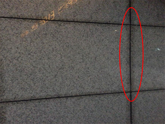 石材幕墻使用充白油硅酮膠,會造成石材表面污染,難以清洗,只有重新更換石材,見下圖。