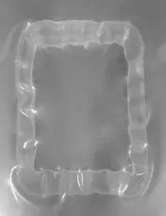 將待測硅酮密封膠涂在一定厚度的聚乙烯( PE) 塑料薄膜上并刮平,經(jīng)過數(shù)個小時后觀察密封膠邊部塑料薄膜是否平整;如果塑料薄膜變得不平整,那么該密封膠基本可判定為充白油膠,見下圖。