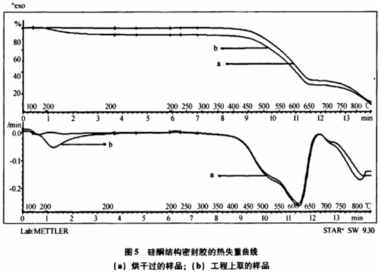 下圖為該工程所用硅酮密封膠熱失重曲線。曲線a為硅酮膠在90℃高溫下烘干2天后的熱失重曲線;曲線b為未處理硅酮膠的熱失重曲線。