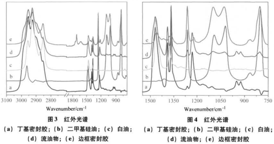 可見,流油物特征吸收峰和丁基膠基本一致,說明流油物主要成分為丁基膠;邊框密封膠中不僅含有二甲基硅油,還含有白油等劣質(zhì)增塑劑。