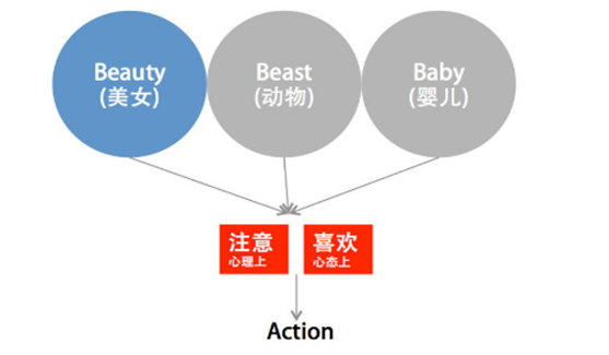 廣告大師大衛(wèi)·奧格威從創(chuàng)意入手,提出了3B原則,即beauty——美女、beast——動物、baby——嬰兒。3B原則作為一種廣告表現(xiàn)手法,具有記憶度高,更容贏得消費者的注意力,從而達到品牌嫁接實現(xiàn)寄生的目的。