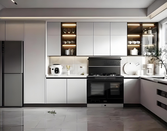 照明是提升廚房氛圍的重要元素。集成灶上方可以安裝射燈或吊燈,增強(qiáng)烹飪區(qū)域的亮度。同時,照明設(shè)計應(yīng)與整體廚房照明相協(xié)調(diào),營造出溫馨舒適的烹飪環(huán)境。