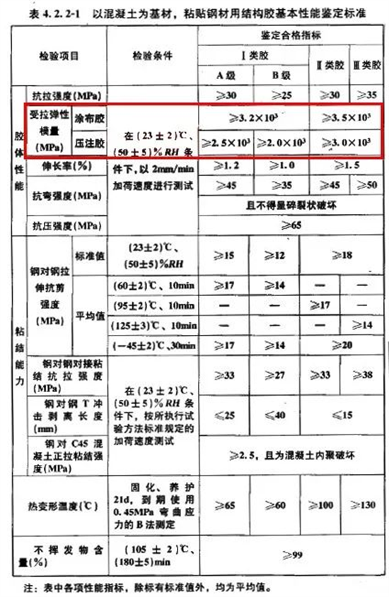 很多廠商就在這一點上打主意,宣稱自己生產(chǎn)的加固材料彈性模量超高,加固中的戰(zhàn)斗機!真的是這樣嗎?請注意,我們鑒定材料基本性能并不只是彈性模量一個指標,另外還有強度、伸長率、抗剪切方面的鑒定。強度很容易與剛度混淆,它是指材料在外力作用下抵抗破壞(變形和斷裂)的能力。下面我們拿結(jié)構(gòu)涂布膠來舉例說明,如圖3所示,其抗拉彈性模量,Ⅰ類膠3.2×103Mpa,Ⅱ類膠3.5×103Mpa,Ⅰ類膠A級伸長率1.2%,Ⅰ類膠B級伸長率1.0%,Ⅱ類膠伸長率1.5%,Ⅰ類膠A級抗剪強度,Ⅰ類膠B級抗剪強度14Mpa,Ⅱ類膠不抗剪。由上面參數(shù)可以得出,雖然Ⅰ類膠彈性模量不占優(yōu)勢,但是綜合其他力學參數(shù)來看,Ⅰ類膠的性能是優(yōu)于Ⅱ類膠。如果材料不容易發(fā)生形變,但卻很容易被拉斷或剪切,這就是有了剛度但沒有強度,這在加固上是行不通的,如果使用了這樣的材料就不能達到真正意義上的加固。所以好材料必須是高彈性模量、高強度配上適當?shù)纳扉L率、剪切強度才能真正發(fā)揮加固的作用。