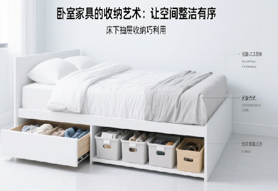 現(xiàn)在很多床都設(shè)計(jì)了收納功能,這是一個(gè)不可忽視的收納區(qū)域。床底下的空間可以用來存放一些不常用的物品,如過季的鞋子、行李箱等。為了方便取用物品,可以使用帶輪子的收納盒,將物品分類放入其中,需要時(shí)只需將收納盒拉出即可。