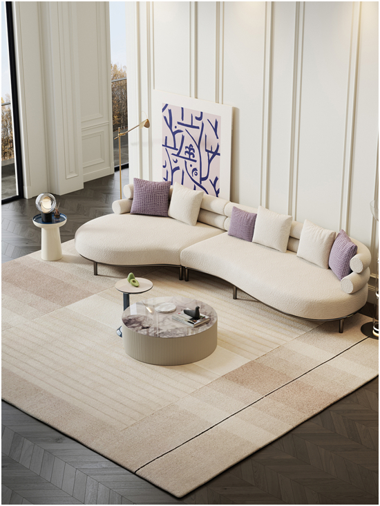 洛品有家奶油白弧形沙發(fā),搭配同色調(diào)的硬裝,極簡(jiǎn)卻不顯冷清。綿軟的奶油色調(diào)帶來滿滿的治愈力。圓弧造型優(yōu)雅而富有個(gè)性,柔化室內(nèi)空間的同時(shí),營(yíng)造自然舒適的空間氛圍。莫奈紫格紋抱枕為之增添點(diǎn)睛一筆。