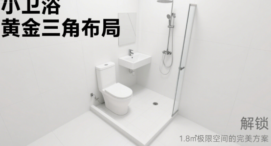 所謂黃金三角布局,是指將衛(wèi)浴間的三大主要功能區(qū)域——馬桶、洗手臺和淋浴區(qū),合理地分布在一個近似三角形的空間內(nèi),形成一個高效、便捷的使用流線。這種布局的優(yōu)勢在于能夠最大程度地利用空間,減少不必要的走動距離,提高使用效率。對于1.8㎡的極限小衛(wèi)浴來說,黃金三角布局更是顯得尤為重要。