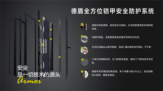 有業(yè)內(nèi)專家分析,德盾之所以能如此迅速地大規(guī)模量產(chǎn)裝甲門,得益于其在門鎖領(lǐng)域?qū)Π卜兰夹g(shù)的潛力研究與不斷突破。據(jù)悉,德盾研發(fā)了一整套裝甲防護(hù)系統(tǒng),從里到外,從上到下層層防護(hù)。