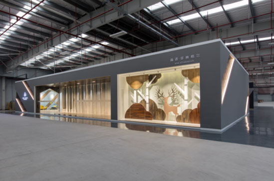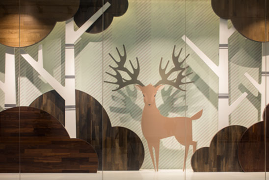 顧客首先會見到簡潔幾何風(fēng)格的外立面,感受北歐生活的整體氛圍;櫥窗所講述的森林中的故事強化了這種氛圍,并形成記憶點。入口走道的屏風(fēng)(屏風(fēng)裝修效果圖)用錯視覺手法展現(xiàn)林中樹木層疊的畫面,半透視效果引入人流,仿佛真的是一條通往森林深處的小徑。
