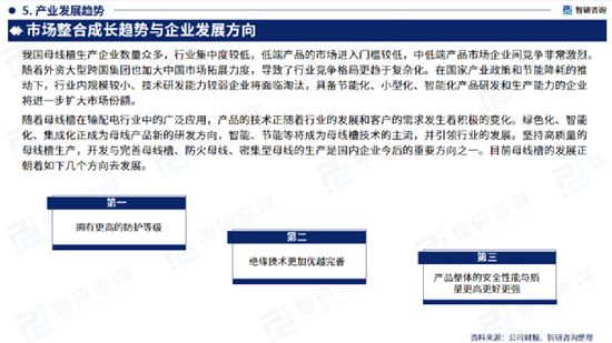 我國母線槽生產(chǎn)企業(yè)數(shù)量眾多,行業(yè)集中度較低,低端產(chǎn)品的市場進入門檻較低,中低端產(chǎn)品市場企業(yè)間競爭非常激烈。隨著外資大型跨國集團也加大中國市場拓展力度,導(dǎo)致了行業(yè)競爭格局更趨于復(fù)雜化。在國家產(chǎn)業(yè)政策和節(jié)能降耗的推動下,行業(yè)內(nèi)規(guī)模較小、技術(shù)研發(fā)能力較弱企業(yè)將面臨淘汰,具備節(jié)能化、小型化、智能化產(chǎn)品研發(fā)和生產(chǎn)能力的企業(yè)將進一步擴大市場份額。堅持高質(zhì)量的母線槽生產(chǎn),開發(fā)與完善母線槽、防火母線、密集型母線的生產(chǎn)是國內(nèi)企業(yè)今后的重要方向之一。