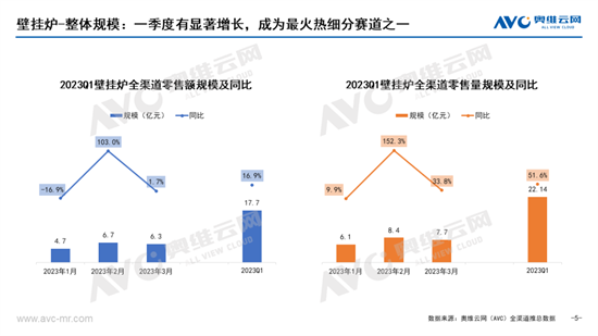 據(jù)奧維云網(wǎng)(AVC)推總數(shù)據(jù)顯示,2023年一季度,壁掛爐零售額17.7億元,同比增長16.9%,增長的主要原因一方面是同期壁掛爐市場受到嚴(yán)重的疫情影響,另一方面,主流品牌的優(yōu)質(zhì)產(chǎn)品正在逐步打開品類在消費者中的認(rèn)知度,行業(yè)正在走向“后煤改”時期的轉(zhuǎn)型優(yōu)化期。