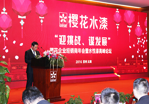 2016年3月16日,主題為“迎挑戰(zhàn)·謀發(fā)展”櫻花企業(yè)經(jīng)銷商年會(huì)暨水性漆高峰論壇在蘇州太湖國(guó)際會(huì)議中心隆重舉行,櫻花水漆董事長(zhǎng)朱小明、副總經(jīng)理朱力、富泰化工總經(jīng)理傅志平、涂料老爺子施青林老師,以及櫻花水漆經(jīng)銷商代表近400人參加此次峰會(huì)?;勐斁W(wǎng)亦出席本次峰會(huì)并做現(xiàn)場(chǎng)報(bào)道。