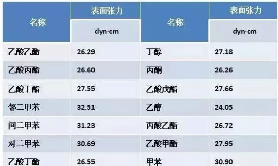 由于水性涂料以水作為稀釋劑,水的表面張力為72.6dyn/cm(達因/厘米),要比一般有機溶劑大,是涂料常用有機溶劑的2.5倍(見下表),因而難以潤濕底材,易產(chǎn)生縮孔,所以一方面通過在水性涂料生產(chǎn)配方中添加表面活性劑來降低表面張力,提高潤濕性能,另一方面,在進行工件的前處理時,對工件表面處理的質(zhì)量要求更高。