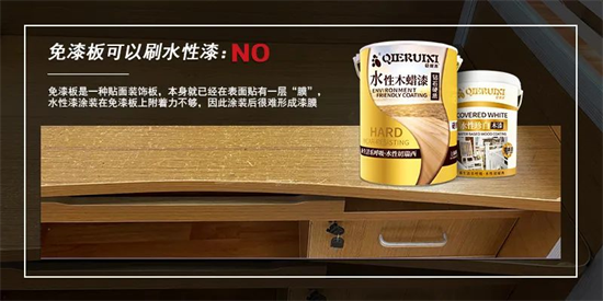 由于免漆板是一種貼面裝飾板,本身就已經(jīng)在表面貼有一層“膜”,水性漆涂裝在免漆板上附著力不夠,因此涂裝后很難形成漆膜,即使實(shí)干后形成漆膜也容易起皮脫落,一摳即掉無法達(dá)到水性漆的涂裝目的。因此免漆板一般不推薦使用油漆或者水性漆進(jìn)行涂裝。
