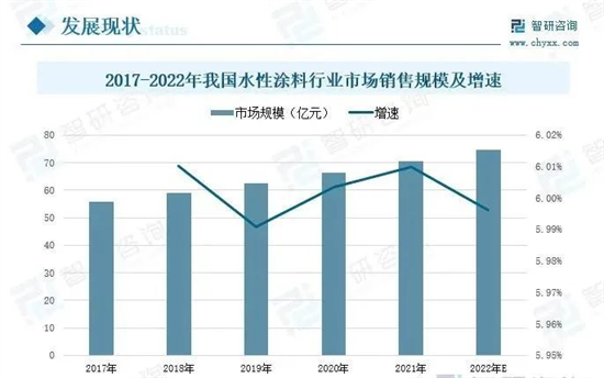 根據(jù)一份報(bào)告,2021年我國(guó)水性涂料的市場(chǎng)規(guī)模同比增長(zhǎng)了6.01%,預(yù)計(jì)2022年行業(yè)市場(chǎng)規(guī)模將會(huì)進(jìn)一步增長(zhǎng),水性涂料市場(chǎng)規(guī)模達(dá)到74.6億元左右。