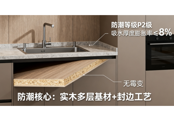 生態(tài)板(學(xué)名“浸漬膠膜紙飾面人造板”)以多層實木基材為核心,表面覆貼浸漬膠膜紙,經(jīng)高溫高壓制成。相較于普通板材,防潮款生態(tài)板通過在基材中添加防潮劑、優(yōu)化封邊工藝等技術(shù),提升了抗?jié)裥?。但“防潮”是否等同于“完全防水?它能否真正適應(yīng)廚房的復(fù)雜環(huán)境?這需要從材質(zhì)特性、技術(shù)工藝和實際應(yīng)用場景綜合分析。