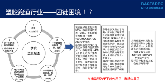 “在這樣的情況下,一部分做好跑道的企業(yè)因無法生存被迫投向了低價(jià)一方,那么市場又重新做了均衡:做好跑道的只有30%,做差跑道的變成了70%,市場價(jià)格也很快做出均衡調(diào)整:400*30%+200*70%=260元/平方米。這時(shí),追求好品質(zhì)的用戶只愿意支付市場均衡價(jià)260元了。做好跑道(400元)的企業(yè)為了生存不得不普遍降質(zhì)來迎合市場,也有一批企業(yè)選擇退出行業(yè),或者轉(zhuǎn)向國際、民辦學(xué)校這類具有高要求和獨(dú)立采購需求的高凈值用戶群體。”