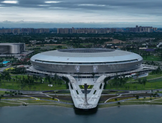 東安湖體育公園主體育場是一座建筑面積約32萬平方米的是大型甲級(jí)體育場,可容納4萬人。場館大量采用鋼制構(gòu)件,打造了獨(dú)具科技感的“飛碟”造型。正圓形體育場屋頂?shù)奶柹聒B圖案融入了古蜀文化的特征,實(shí)現(xiàn)了傳統(tǒng)與現(xiàn)代的有機(jī)結(jié)合。該圖案寬度約46米,總面積約2.7萬平方米,由12160塊安全玻璃拼裝組成,并利用彩釉技術(shù)確保圖案色澤、品質(zhì)經(jīng)久不衰。