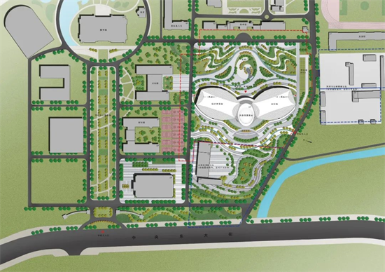 景觀作為本項(xiàng)目重要的設(shè)計(jì)環(huán)節(jié),在最初的規(guī)劃中確定了采用自然流動的曲線勾勒出花園式的校園環(huán)境。