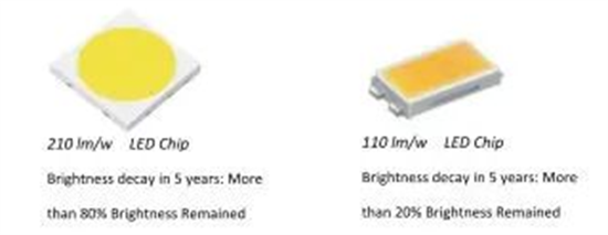 210lm/w:亮度在5年內(nèi)衰減,亮度仍保持80%以上。