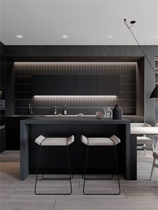 所以餐廚一定要有重點照明和輔助的局部照明,可以在操作臺櫥柜后面安裝燈帶,補充臺面照明;餐桌上方選用顏值高的小吊燈,或加裝均勻分布的射燈或筒燈,增加漫反射照明,創(chuàng)造柔和的光線和用餐氛圍。