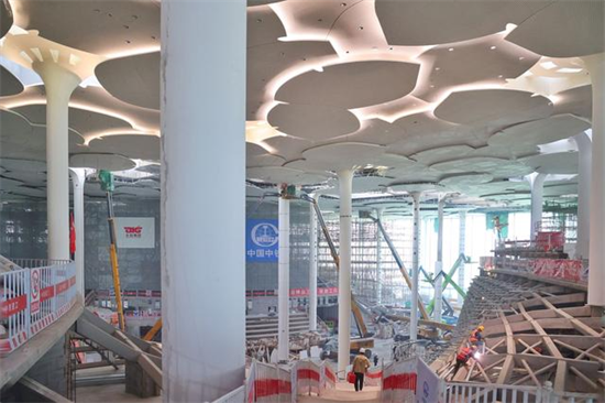 2023年4月19日傍晚,記者走進中鐵建工集團承建的北京城市副中心圖書館項目施工現(xiàn)場。抬頭往上看,天花吊頂最中心區(qū)域,大空間的立柱宛如挺拔的樹木,頂部有滿鋪葉片造型,錯落相疊。每一塊銀杏葉片形狀的板材,都被隱藏式燈帶鑲上了銀白色的邊,“銀杏葉”上還有一個個閃閃發(fā)光的燈筒,增添藝術氣息的同時,也讓整個天花板區(qū)域更顯靈動。