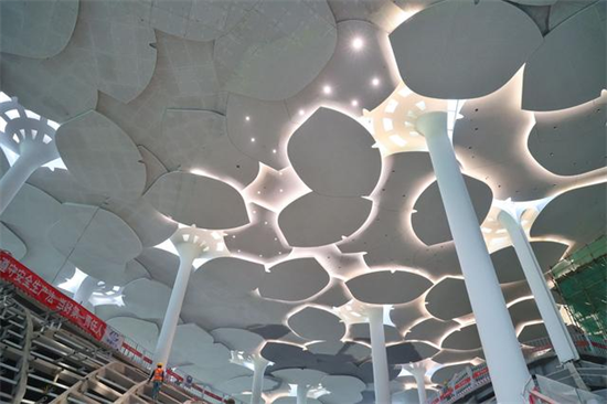 由北投集團全過程代建的北京城市副中心三大建筑之一,被譽為“森林書苑”的圖書館項目,目前已為3000平方米大空間天花吊頂安裝上了燈帶和燈筒。銀杏葉片形狀的吊頂葉片,搭配上白色的燈光,非常有藝術氣息。該項目大空間天花吊頂總面積約20000平方米,預計下月初全部完成內(nèi)部照明設施安裝工作。