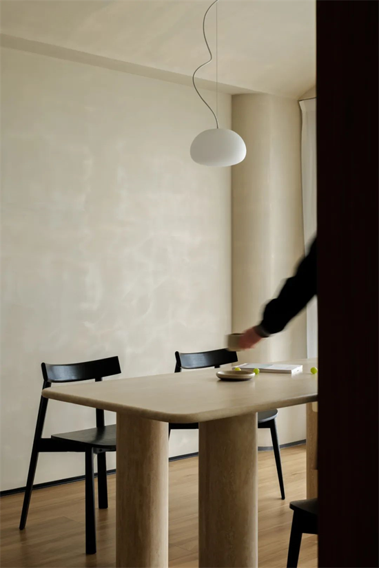 寬大的洞石餐桌,與墻面的微水泥相呼應(yīng),達(dá)到舒緩的美學(xué)平衡,黑色餐椅點(diǎn)綴其中,精致利落也中和了暖調(diào),滿足平時(shí)家人三餐,也能承載三五好友的周末聚餐,大家一起邊聊天邊備餐,令人倍感珍惜。當(dāng)光影穿過玻璃,居住者也能一寸寸感受時(shí)間的流動(dòng)。