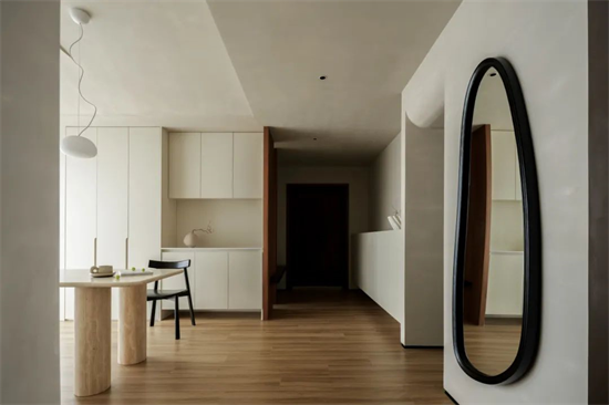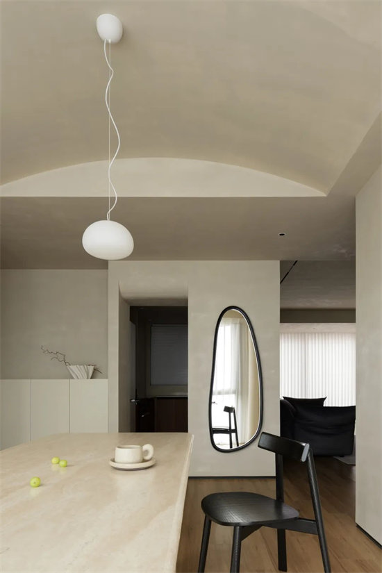 沿著玄關(guān)向里,便是開放式餐廚空間,設(shè)計(jì)師將原本帶來閉塞感的多余墻體去除,重新劃分后引光入室,打破原有局限感,讓光形成聯(lián)動(dòng),天花板吊頂做圓弧處理,露出的梁并未刻意遮蔽,自然造型更顯建筑氣質(zhì)的同時(shí),也延伸了空間層次感。