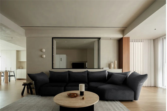 與廚房一窗之隔便是客廳,作為家的主體部分,屋主從始至終所強(qiáng)調(diào)的感官舒適在這里體現(xiàn)得淋漓盡致,寬敞柔和的空間調(diào)性,留白和木色的溫婉細(xì)膩,帶來更純粹沉靜的質(zhì)感。