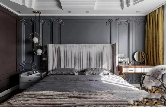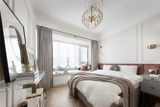 “主燈”吊燈+燈帶+射燈+臺燈,吊燈、燈帶、射燈“合作”提供全屋照明,且吊燈又具有裝飾性,燈帶又可以烘托環(huán)境氛圍,射燈又可以作為局部加強照明使用;兩側(cè)床頭柜擺放的臺燈作為床頭區(qū)的局部照明使用;擺放在與床尾相對的斗柜上的臺燈,作為局部照明,烘托環(huán)境氛圍使用,空間高級、亮堂、柔和,“不硬”……