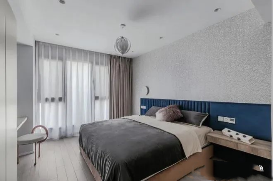 “主燈”吊燈+射燈,吊燈提供全屋照明,射燈則安裝在床頭上方的頂面區(qū)域,作為局部照明的加強,以滿足床頭區(qū)的燈光使用需求,空間敞亮也不失“細節(jié)感”……
