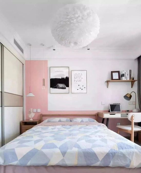 ⑨小吊燈?!盁纛^”部分尺寸較小的吊燈,一般在臥室中安裝于或是床頭一側(cè)/兩側(cè),或是梳妝臺、書桌等功能區(qū)的頂面,作為輔助燈光,用于加強局部照明使用;