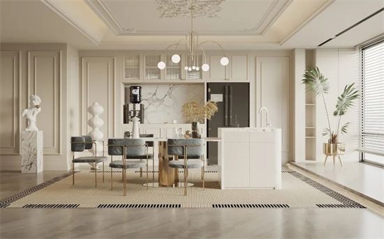 餐廳是一家人三餐都要聚集的地方,為了留出足夠的過道空間,嵌入式餐邊柜是比較合適的設(shè)計。墻面與柜門齊平,嵌入式餐邊柜增加儲物空間的同時,也維持了餐廳的干凈整潔。