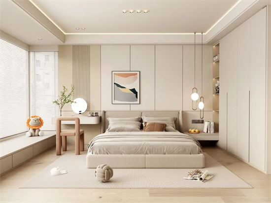針對臥室的想象,體驗(yàn)感應(yīng)排在首位。嵌入式一門到頂衣柜將收納空間極大擴(kuò)充,同時不會阻礙視線,實(shí)現(xiàn)充分的采光。將柜體的絕大部分都嵌入墻體之中,打造“隱藏式”收納,更加節(jié)省空間,同時使得臥室更具有整體性。