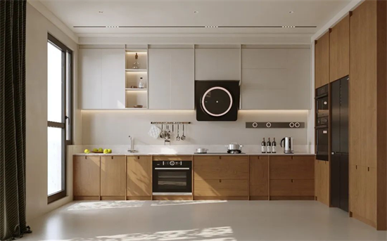 空間小、東西多是大多數(shù)廚房的通病,內(nèi)嵌廚電是日常生活中比較常見解決辦法,洗碗機(jī)、蒸烤箱、冰箱……都直接嵌入柜體,既不占廚房空間,操作使用也很方便,還能夠有效避免油污,大大減少了清潔工作量。但是要注意的是,在定制柜子前必須要確定好電器的大小,同時預(yù)留好插座電位。像冰箱這種需要散熱的家電,還不能完全與柜體貼合,四周需要預(yù)留10cm左右的距離。