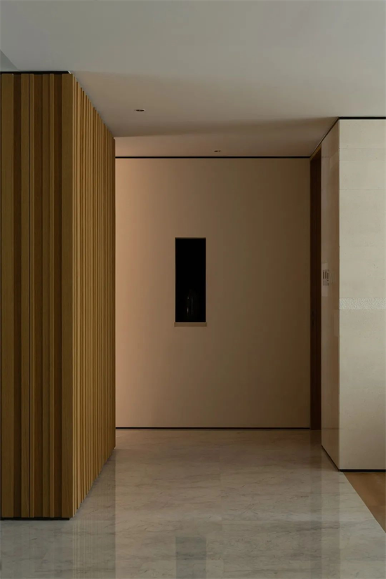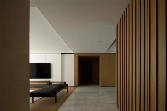 從玄關至臥室過道長達6米多,于是地面材質的拼接處向南面偏移,產生橫向視覺偏差,打破超長尺度的乏味,雅柏灰大理石沒有復雜的花紋,在大面積的木飾面中如同紳士般奢而不華,低調內斂。