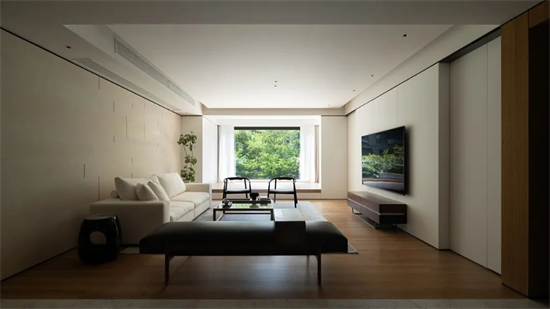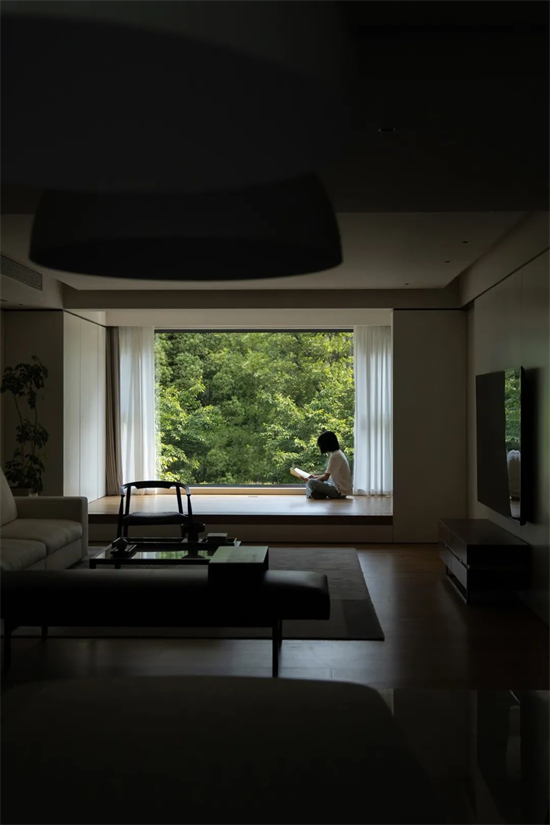 步入客廳,室外的植被群落將盎然的綠意濃縮于一窗,寬2米4的地臺賦予了居家多種活動的可能性,席地而坐,或閱讀或品茶,眺望遠方向自然滲透尋找自由與生機,看見花木的生命力,建立空間和自然的默契互動。