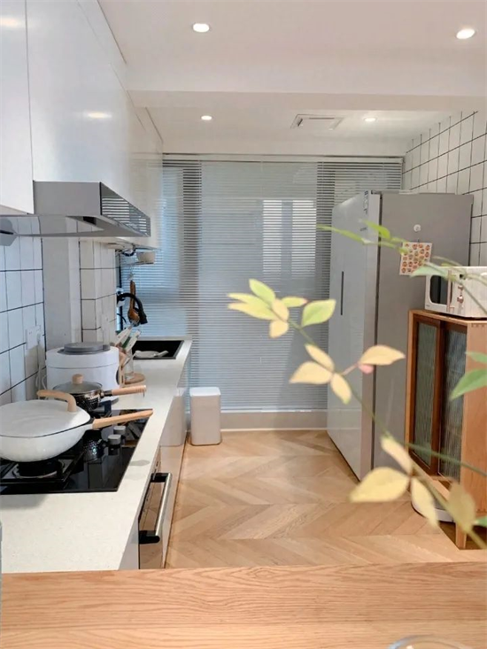 關(guān)于戶型改造,屋主最滿意的就是廚房了,由封閉式廚房打造成全開式廚房,不僅讓廚房操作臺面增加了,還擴大了整屋的視覺空間。