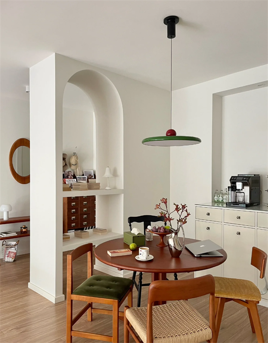 無主燈并不是不要吊燈,有些位置反而恰恰需要吊燈,比如餐桌的正上方就需要一盞吊燈。一來可以烘托用餐氛圍感,二來可以燈光照到食物上會更加誘人。